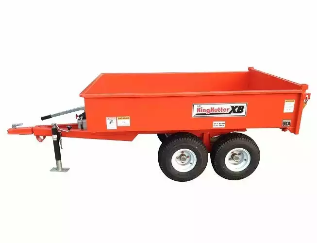 KING KUTTER’S XB-DUMP TRAILERÂ is ideal for landscaping, construction and general gardening. This trailer features a unique two-way tailgate that will open from the top (like a pickup truck) to load or unload large bulky items or will open from the bottom (like a dump truck) for spreading gravel, dirt, sand and many other materials. The tailgate features a cam over latch to control spreading applications. Other features include swivel style hitch, and a double diaphragm hydraulic pump for easy dumping. This unit is constructed with 12 gauge formed steel sides and end panels for maximum strength and durability. The XB Dump Trailer is designed for off road use not to exceed 20 mph.Â