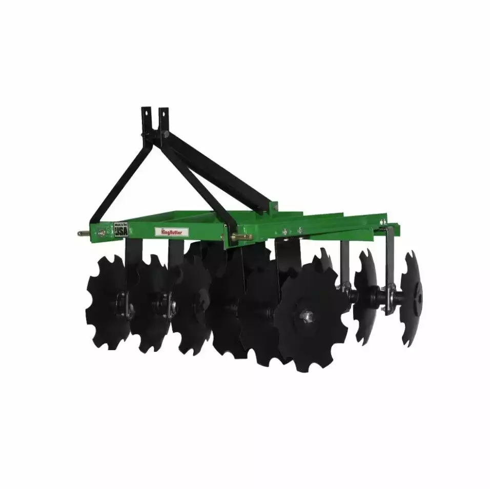 KING KUTTERS PROFESSIONAL ANGLE FRAME DISCS are constructed with heavy rigid angle iron. It connects easily to any three-point hitch with category one specifications. The disc gang axles are made of 1″ square steel rods mounted on double thrust ring gray-iron bearings. All disc harrows have angle adjustments of 10 or 15 degrees. The 5 1/2′ discs have two adjustments and the 6 1/2′ has three.