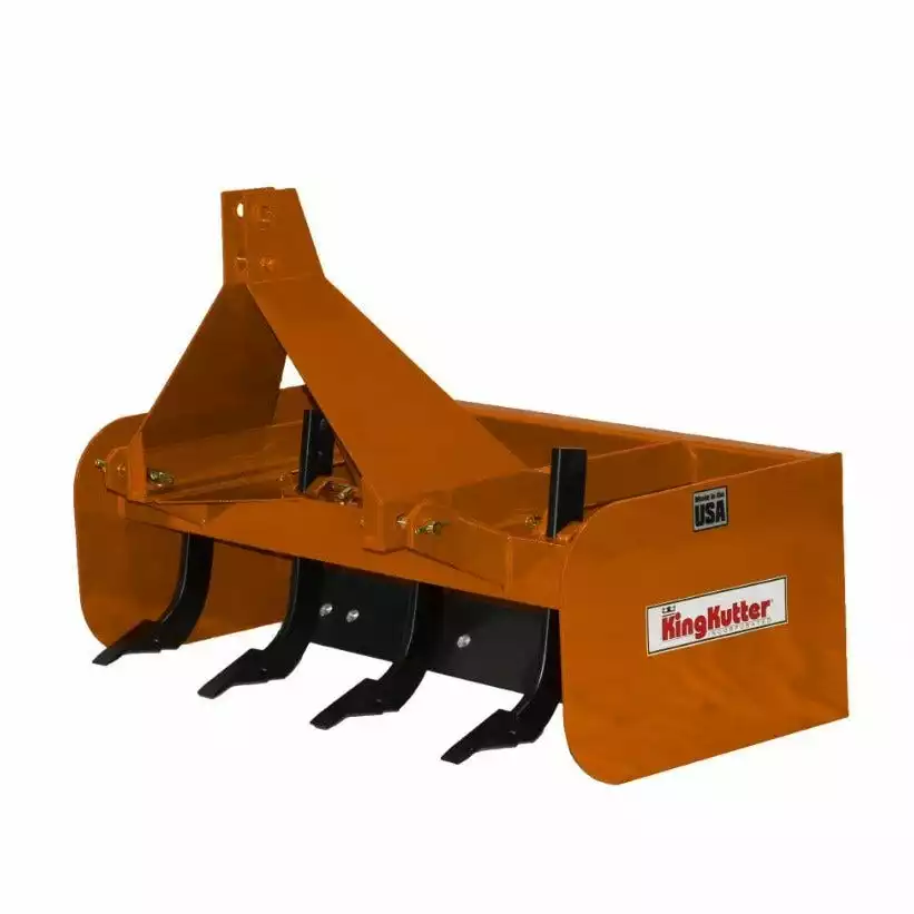 KING KUTTER’S BOX BLADES are designed for rugged use by landscapers, farmers, homeowners, and in light construction. They are great for landscaping, land leveling, backfilling, grading, and many other applications. Each box blade is constructed with a 20″ specially formed self cleaning moldboard. They have 2 high carbon steel reversible cutting edges (one front and one rear). Each unit features heavy duty, ripper shanks with replaceable, heat treated teeth. Each shank has 4 position adjustment holes that pin to the reinforced frame for maximum efficiency. The shank housing is a 1/4″ x 4″ x 4″ box with slotted holes and pins. The upper frame is constructed of heavy gauge steel with replaceable lift and brace arms.