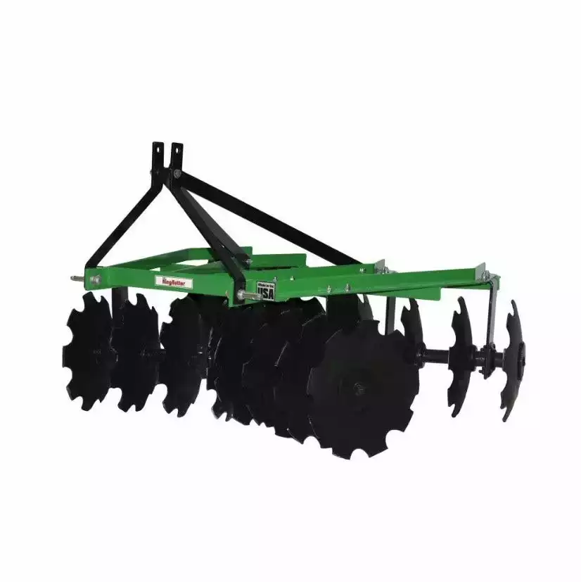 KING KUTTERS PROFESSIONAL ANGLE FRAME DISCS are constructed with heavy rigid angle iron. It connects easily to any three-point hitch with category one specifications. The disc gang axles are made of 1″ square steel rods mounted on double thrust ring gray-iron bearings. All disc harrows have angle adjustments of 10 or 15 degrees. The 5 1/2′ discs have two adjustments and the 6 1/2′ has three.