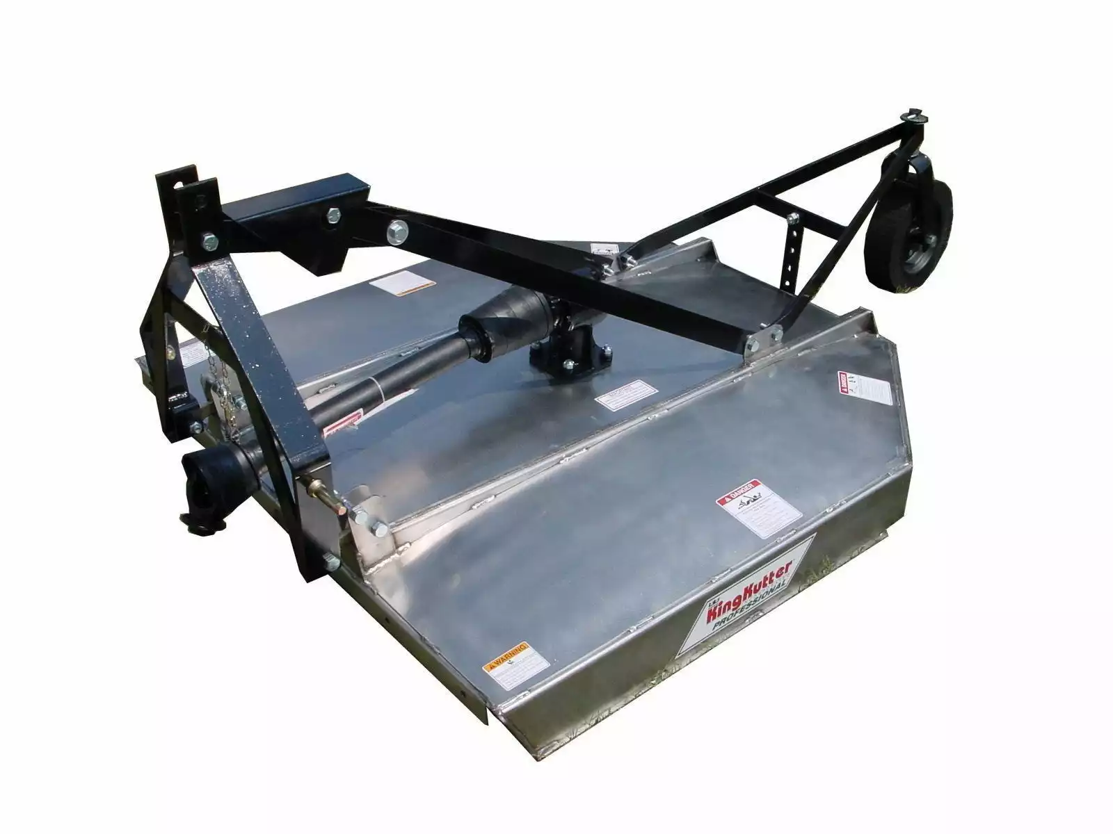 KING KUTTERS PROFESSIONAL FLEX HITCH* ROTARY KUTTERS are the latest in Rotary Kutter innovation from King Kutter Inc. This rotary kutter features a Cat. 1 quick hitchable, flex hitch design, which is unlike any other on the market today. The unique hitch allows it to roll 15 Degrees up or down on the left or right side of the machine, which lets it follow the contours of your field like no rotary kutter before. Shown here with OPTIONAL front and rear chain guards. Another special features includes a sloped deck that sheds water and debris to prevent material from collecting on the deck. Whether mowing pastures, roadsides, parks, or easements, the King Kutter rotary kutter with Flex Hitch is the perfect kutter for you.
