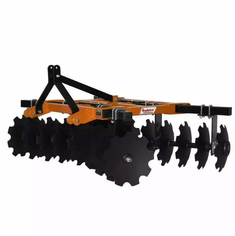 KING KUTTERS PROFESSIONAL BOX FRAME DISC HARROWS are constructed of heavy steel square tubing. It connects to Category 1 Quick Hitch. The disc gang axles are made of 1″ square high carbon steel rods mounted on double thrust sealed steel bearings. These disc harrows have four angle adjustments of 16 degrees, 30 degrees, 44 degrees, and 57 degrees with an easy single bolt adjustment.